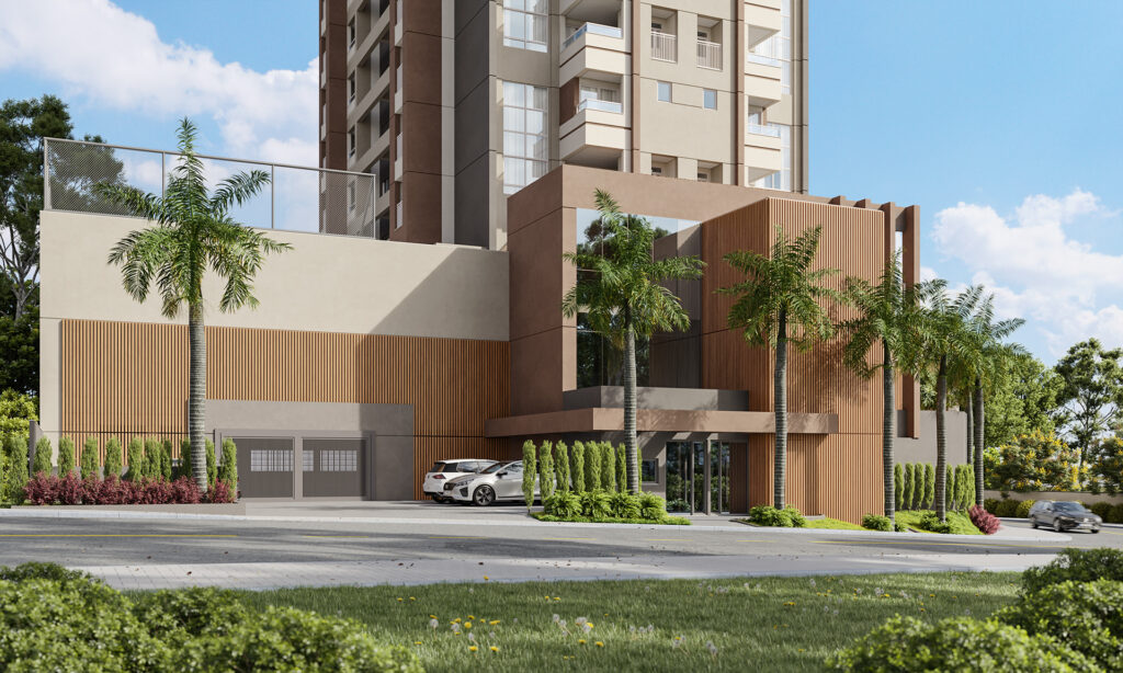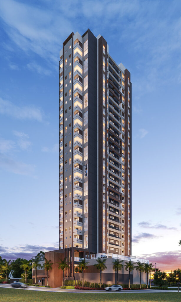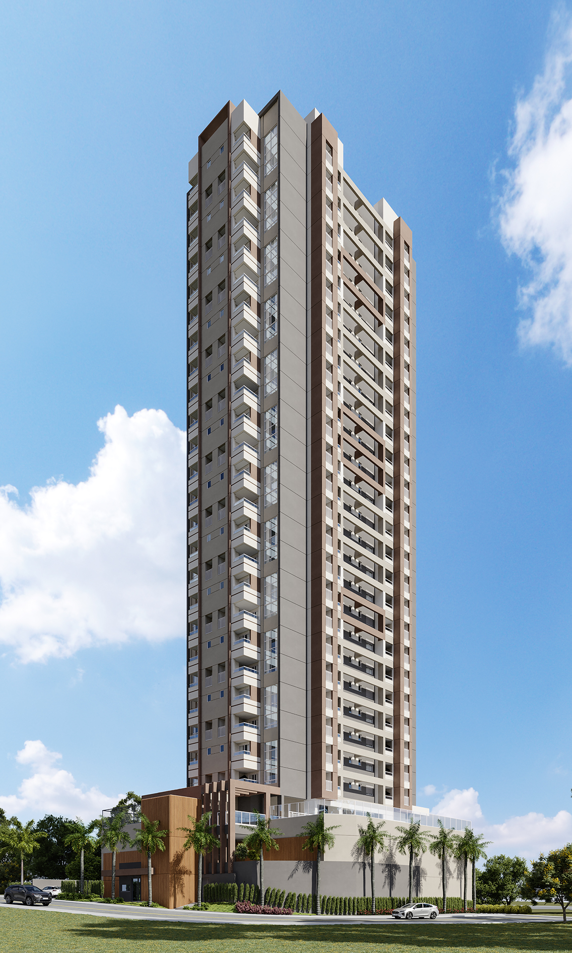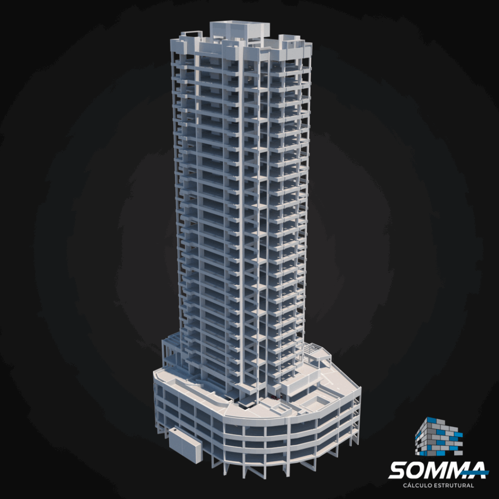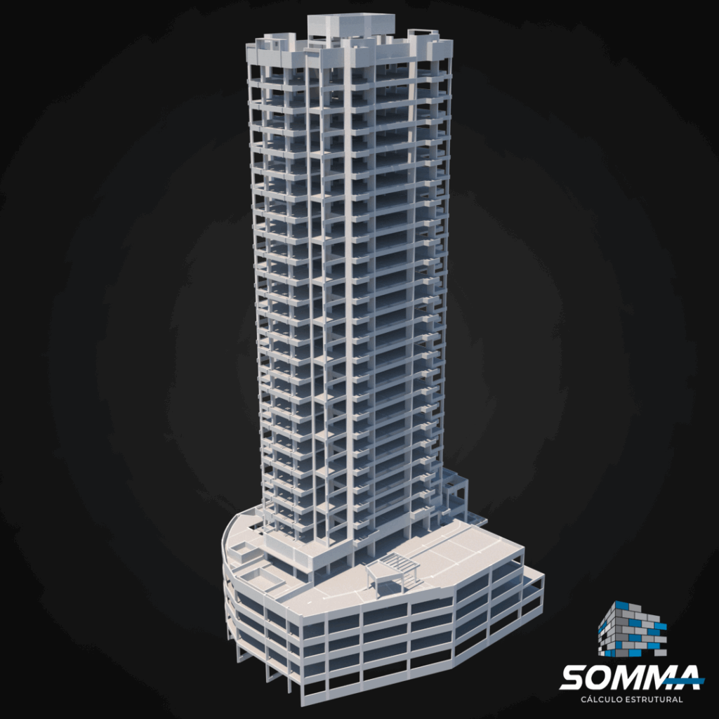 Projeto composto por uma torre de 24 pavimentos, embasamento com lajes nervuradas com 2 subsolos, térreo e 2 sobressolos (um pavimento de estacionamento e outro com área de lazer). Embasamento sem junta de dilatação em concreto armado convencional